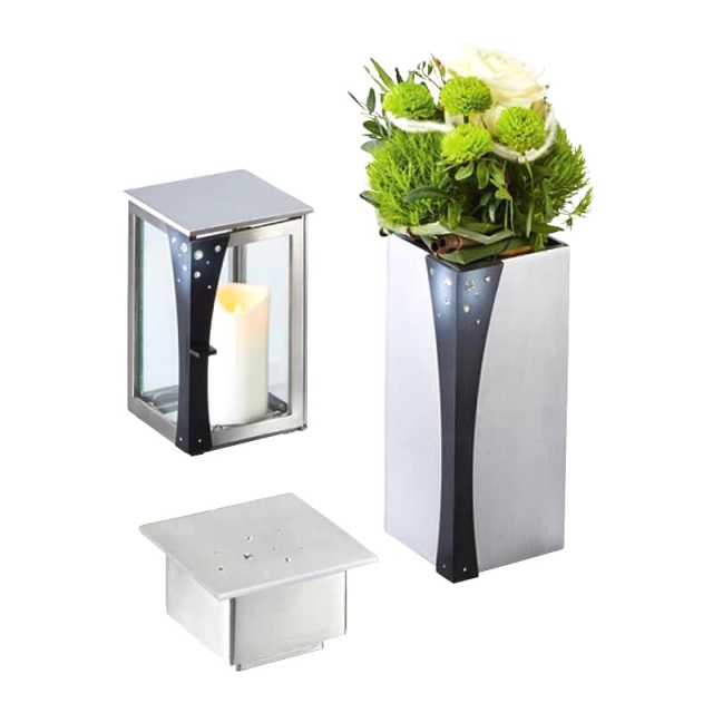 Diese wertvolle Grablaterne wird aus rostfreiem Edelstahl gefertigt und mit edlen Strasssteinen verziert. Das eckige und formschöne Design mit hochwertigen Kristallgläsern lässt das Grablicht auf einem Einzel-, Doppel-, Familien- oder auch Urnengrab würdevoll aussehen. Sowohl klassische Grabkerzen(6 -.Tagebrenner) wie auch LED-Grabkerzen eignen sich für diese wertvolle Grablampe.Die passende Blumenvase sowie Weihwasserschale aus witterungsbeständigem Edelstahl bieten wir hierzu auch an Mit ihrer speziellen Oberflächenimprägnierung behält die eckige und formschöne Grablampe auch nach Jahren hinweg ihr Aussehen bei. Dadurch kann die hochwertige Grablampe ganzjährig auf dem Grab verbleiben .