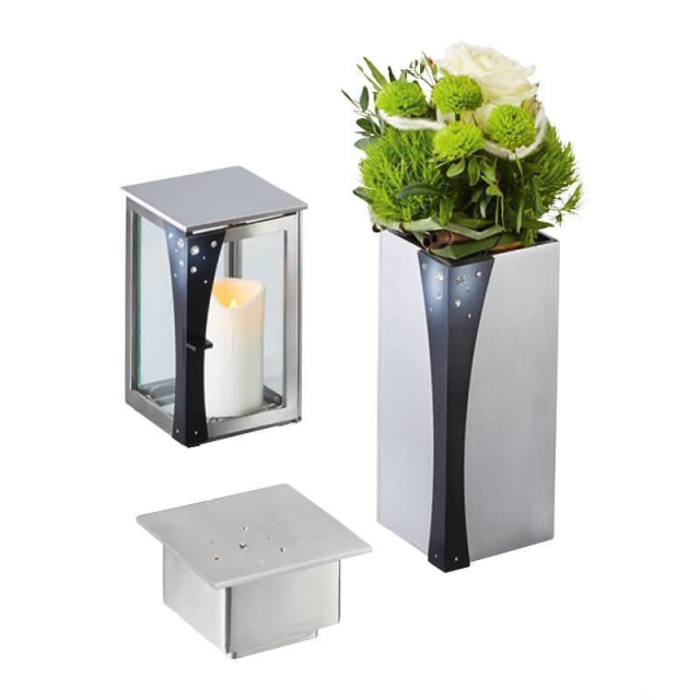 Diese wertvolle Grablaterne vom namhaften Hersteller wird aus rostfreiem Edelstahl für Sie gefertigt und mit edlen Strasssteinen verziert. Das eckige und formschöne Design mit hochwertigen Kristallgläsern setzt das Grablicht auf einem Einzel-, Doppel-, Familien- oder auch Urnengrab würdevoll in Szene. Sowohl normale Grabkerzen wie auch LED-Grabkerzen eignen sich für diese Grablampe.